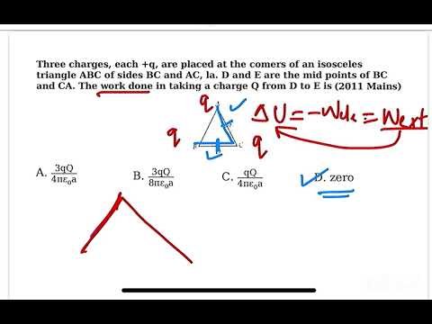 Three charges, each +q, are placed at the comers of an isosceles triangle ABC of sides BC and AC, la. D and E are the mid points of BC and CA. The work done in taking a charge Q from D to E is (2011 Mains)